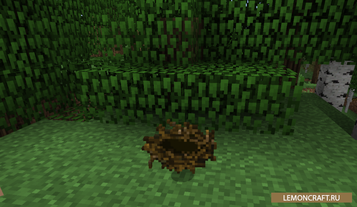 Данный мод добавит в игру птичьи гнезда, которые будут падать при разрушении блоков листвы. Из них вы сможете с определенной вероятностью достать различные предметы: начиная от яиц и заканчивая алмазами.